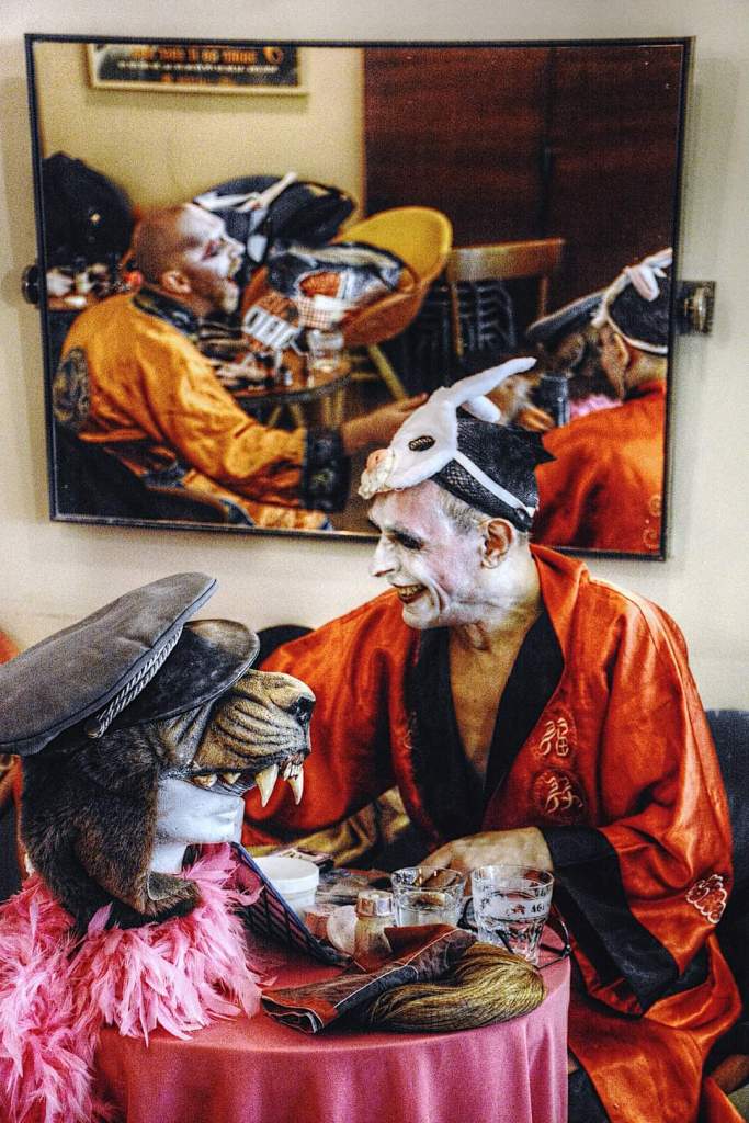 David Noir est annoncé par Monsieur K pour venir chanter. Depuis le brunch, je le voyais à sa table de loge en pleine transformation, et chose étonnante par son caractère performatif, très rare dans l’espace des coulisses, toujours en écoute et en réaction, à vue du public, de ce qui se passe autour. Il arrive, habillé en pépère en charentaises de cauchemar, un postiche en double-menton lui fait un goître tremblant à chaque mouvement de tête parkinsonnien, il s’apprête à entonner sa vieille rengaine lubrique, suspend son souffle, « Attendez, j’ai oublié un accessoire ! » et repart à sa table de loge, de son même pas de vieux en charentaise, marmonnant dans son goître, puis revient avec un sachet en plastique à la main, et entame enfin Elle est épatante, les connaisseurs reconnaîtront une chanson de Michel Simon. Finalement, c’est comme si la chanson, on s’en fout, c’est un bonus : le personnage est déjà là, le numéro existe avant même d’avoir commencé. Tout, chez David Noir, depuis le maquillage, est matière à jeu.
