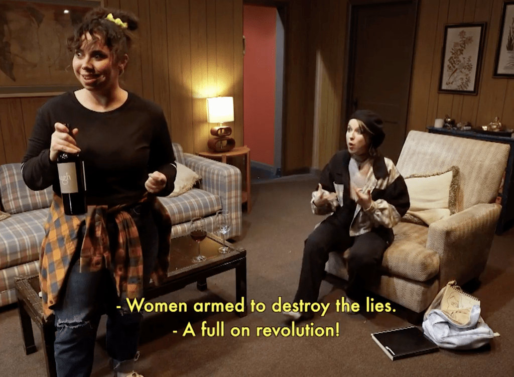 A lot of the nostalgia of Everything for Dawn lies in the production design, which is also responsible for a lot of those memorable details – changing from 4:3 aspect ratio to 16:9 depending on the time of the action, retro spaces which walk the line between aesthetic and sit-com utilitarian, TVs placed in many of the environments, the meta-intros of each episode which have us Zoom in to TVs from the given time in which the action unfolds, an entire episode (episode 8) shot as a reality TV show (though that may have been written into the script), or, after an entire episode filmed in one shot from the perspective of a painting (episode 9, which unfortunately contained some blocking issues in the one-shot format, because there may not have been enough time to rehearse), zooming out onto the back of the painting, teasing the fact that we can’t see it. It’s interesting to note that the production team, most notably the director Alison Moritz, assistant director Ian Silverman, production designer Jean Kim and lighting designers Stacey Boggs and Betsy Chester, have much more experience in theater than in film. In fact, looking from the outside, the film crew was really a theater crew with one primary film advisor, director of photography Eric Thomas Paton, and a film editor, Travis Ford. It was this team, however, that created a lot of the charm of Everything for Dawn. The fact that the lighting was at times blatantly theatrical as opposed to cinematic ended up being interesting rather than tacky. However, I think that in the next such opera-on-screen experiment, there should be more involvement by film experts, just to see what would happen.