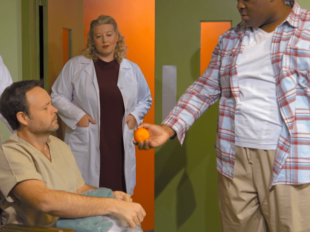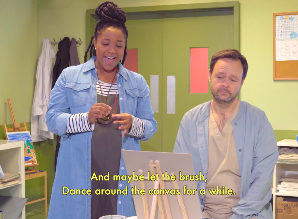 There is something about this story that makes me think Americana, but not in the stereotypical sense of pumpkins and apple pies and baseball. I suppose part of it is that most of the characters are financially insecure yet remain dreamers: a struggling single mom who finds the money to pay into a spiritual cult, her daughter who, despite being working class, wishes to go to art school, the father who is a Vietnam vet (an American trope if there ever was one) hospitalized for his PTSD but who turns out to be a brilliant artist, though until middle age he’d never painted anything except the pinstripes on Buicks. Dawn’s father’s fellow psychiatric ward patient, Ed (Joshua Conyers), who is also a Vietnam vet, offers optimistically-delivered mad diatribes full of American tropes, from Donald Duck to conspiracy theories to his “message missiles” in the form of oranges, which are an American movie trope foreshadowing bad things to come. There’s also the conscious shout-out to how much Americans look to TV for their cultural cues, namely when Dawn says “everything’s like TV normal” which to her means ordering in pizza, watching movies, and breakfast at Denny’s before school (Episode 6, libretto by Krista Knight). The one villain of the show is the psychiatrist Dr. Slade (Laura Strikling) who is gleeful at the thought of shutting down an art therapy program led by the idealistic artist, Joy (Meroë Khalia Adeeb.) Dr. Slade and Joy are the embodiments of good and evil; while Dr. Slade actually gets a thrill from firing people, over-medicating some patients, and prematurely discharging others, Joy is an artist who believes in the power of art as therapy, and also represents the anxiety of artists confronted with justifying their own existence against a market economy, which makes her a stand in, I think, for the creators of the show (sometimes she gives in to her doubts, like when she tells herself: “…you’re useless and a fraud. And this touchy-feely painty thing’s a joke” in episode 5 with libretto by Jerry Lieblich or laments that: “The only thing worse than a starving artist is a starving art therapist” in episode 7 with libretto by Jason Cady.)