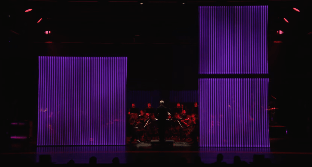 Cet entre est au principe formel de construction (et l’on serait tenté ici de parler de constructivisme) de l’ensemble du spectacle, à commencer par sa scénographie à laquelle est confronté le public dès son entrée dans la salle : trois tulles blancs et semi-transparents, de forme carré. Ces tulles matérialisent le vide, le silence et le blanc qui séparent, tout en les reliant, théâtre et musique : derrière eux, en fond de scène, l’orchestre dirigé par Clément Mao-Tackacs ; devant eux l’espace scénique du théâtre, sorte de proscenium où évoluera l’acteur Thomas Kellner. Cette dichotomie scénographique, fidèle en cela à l’hantologie du between, sera constamment mise en crise pendant le spectacle, que ce soit par l’arrivée sur le proscenium des solistes (la soprano Tuuli Lindeberg dans Study for Life, le violoniste Peter Herresthal dans Graal Théâtre), ou par les quelques furtives intrusions ou les regards jetés par l’acteur Thomas Kellner dans l’arrière-scène.